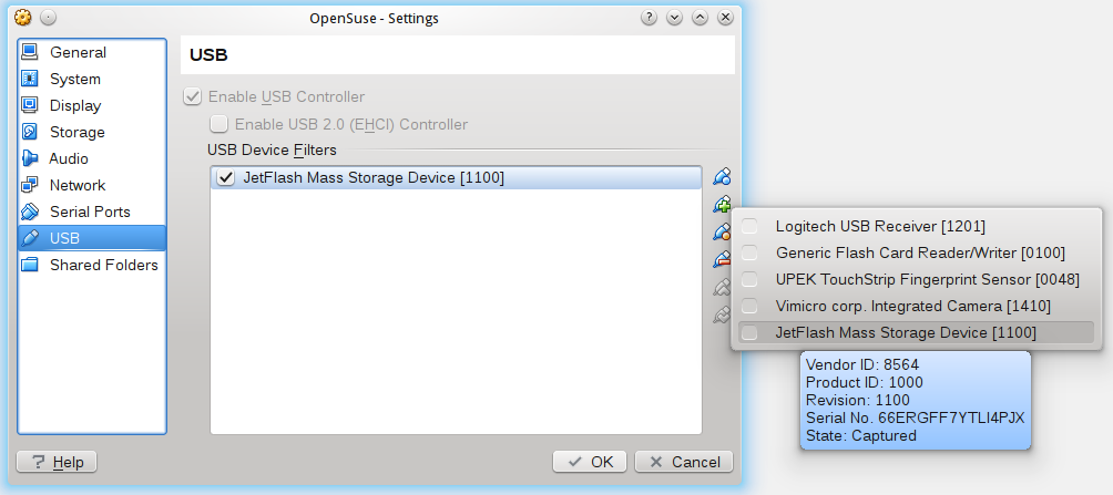 Теперь запускаем VirtualBox, выбираем интересующую виртуальную машину либо создаем новую, открываем настройки виртуальной машины. В окне настроек выбираем вкладку USB(слева), затем добавляем новый usb фильтр: